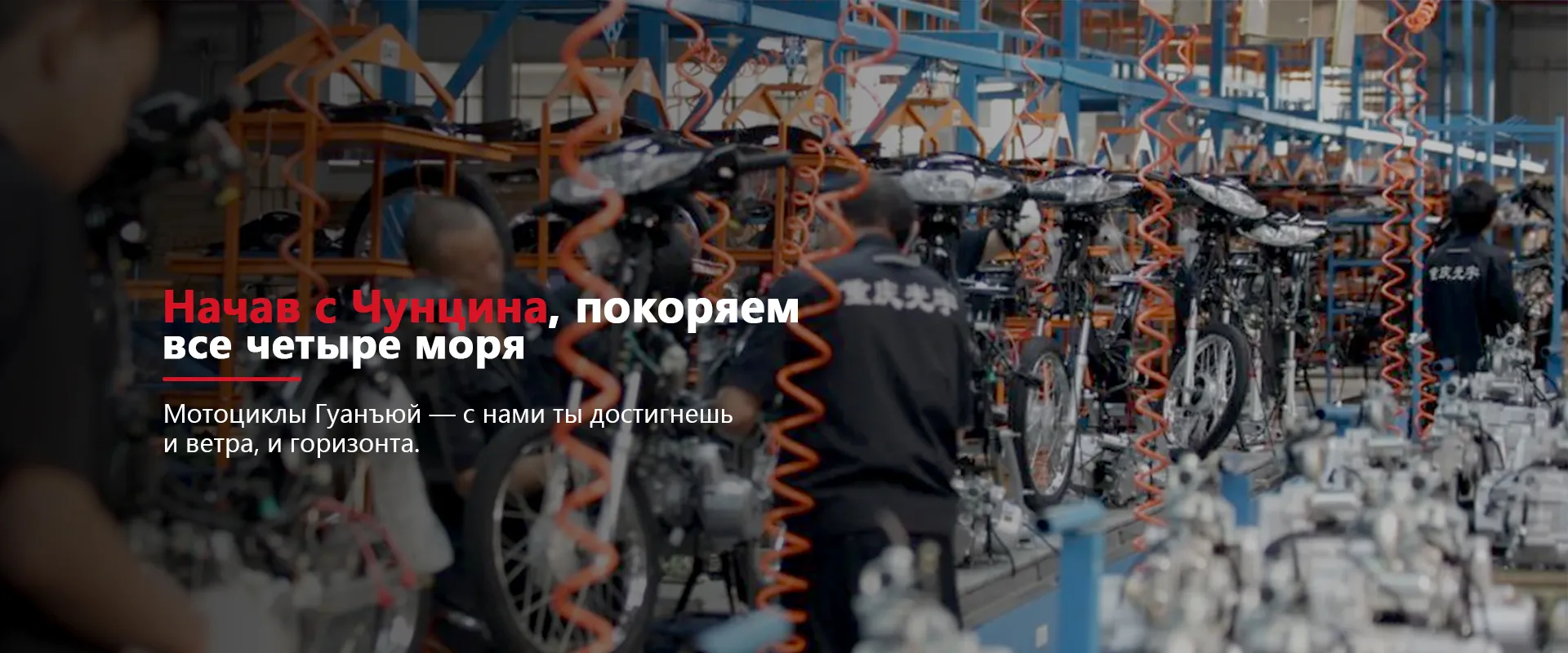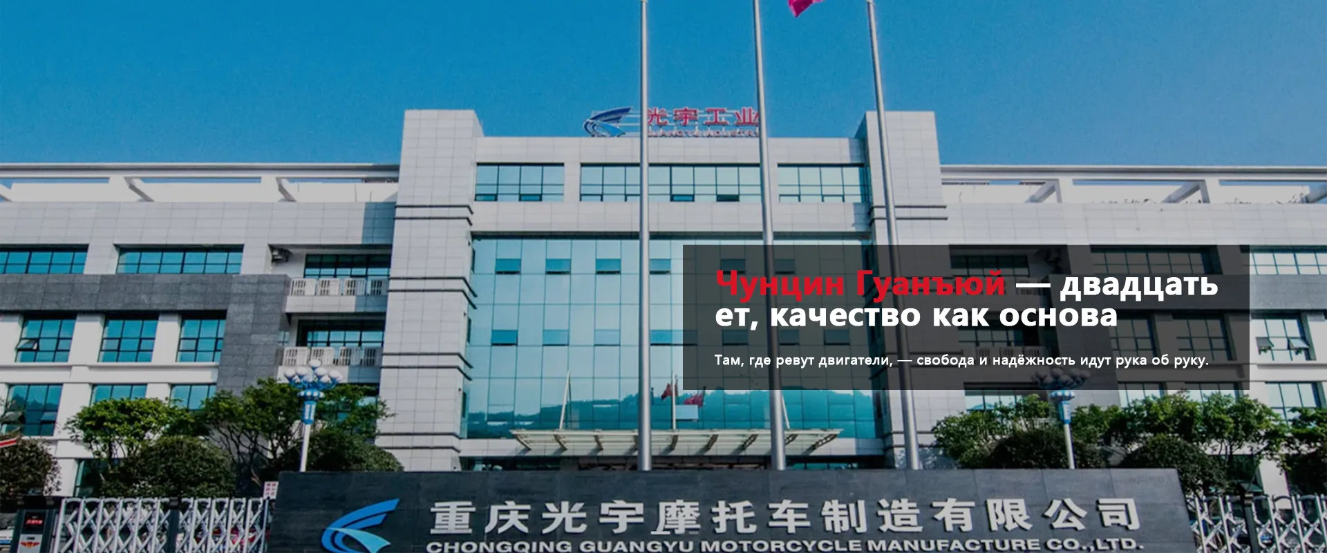 ООО Чунцин Гуанъюй Производство Мотоциклов, расположенное в районе Банань города Чунцин, является предприятием, аккредитованным Министерством промышленности и информатизации КНР, которое интегрирует проектирование продукции, производство и международную торговлю различными типами мотоциклов, мотоциклетной техники и запасных частей.